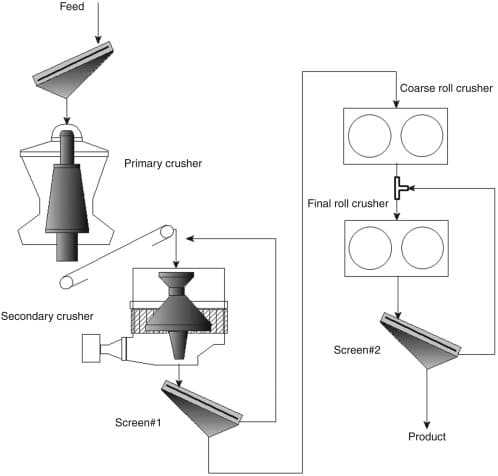 Mined crushed stone is loaded into trucks or onto conveyors and transported to the processing facility. The broken stone is dumped into a primary crusher where the large rock fragments are broken into smaller sizes. Crushing to the proper size usually occurs in stages because rapid size reduction, accomplished by applying large forces, commonly results in the production of excessive fines. So primary crushers should be solidly built in order to receive large lumps of rock directly from the mines and designed for large tonnage throughputs.