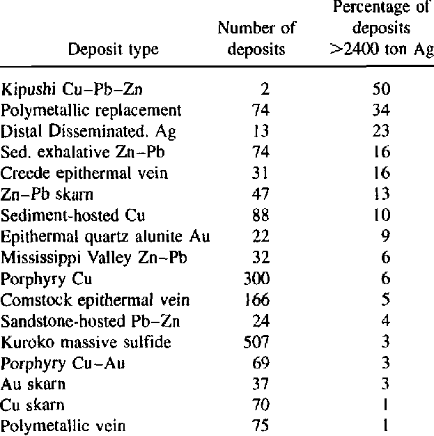 The world mineral resources of silver ores are mainly located in Russia, Mexico, Canada, USA, Australia and Peru. major silver deposits can be grouped as following types: (1) epithermal vein silver, related to the Mesozoic and Cenozoic volcanic ore and subvolcanic rocks, (2) porphyry silver type; (3) silver bearing massive sulfide deposit in volcanic rocks; (4) sedimentary type silver bearing polymetallic deposit; (5) sedimentary remoulded type silver bearing polymetallic deposit in carbonate rocks.