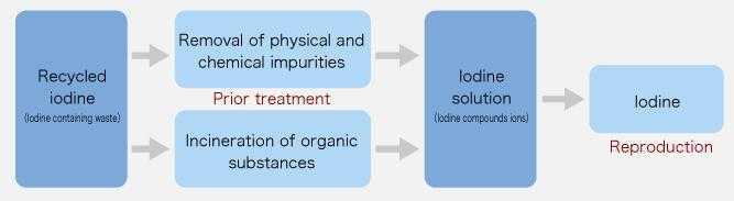Most of the iodate solution from leaching goes through a sulfur oxide absorption tower. The iodide produced mixes with the rest of the iodate solution, which results in a suspension. The iodine in suspension is reduced to iodide, with the addition of sulfur oxide, and then recovered as a concentrated iodide solution. Most iodine precipitates out of the solution to form crystals, which are captured by flotation.
