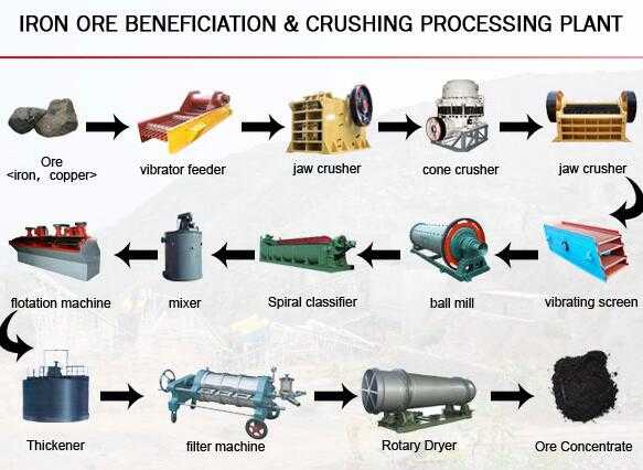 1. Large raw iron ore for primary crushing are fed into the jaw crusher by Plate feeder and are reduced to 8 inches or smaller. After first crushing, the material will be transferred to cone crusher by belt conveyor for secondary crushing; the crushed iron ore stone will then transferred to vibrating screen for classifying. After classifying, the parts whose size below the mesh size will be transferred away as final products, while the other parts will return to cone crusher, thus forming a closed circuit. Size of final products can be combined and graded according to your specific requirement.