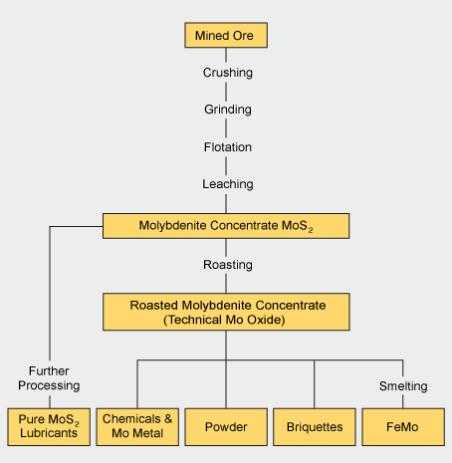 Molybdenum is an important material for the chemical and lubricant industries. “Moly” has uses as catalysts, paint pigments, corrosion inhibitors, smoke and flame retardants, dry lubricants, on space vehicles and is resistant to high loads and temperatures. As a pure metal, molybdenum is used as filament in light bulbs, metal-working dies and furnace parts. It is alloyed with steel making it stronger and more highly resistant to heat. The iron and steel industries account for more than 75% of molybdenum consumption.