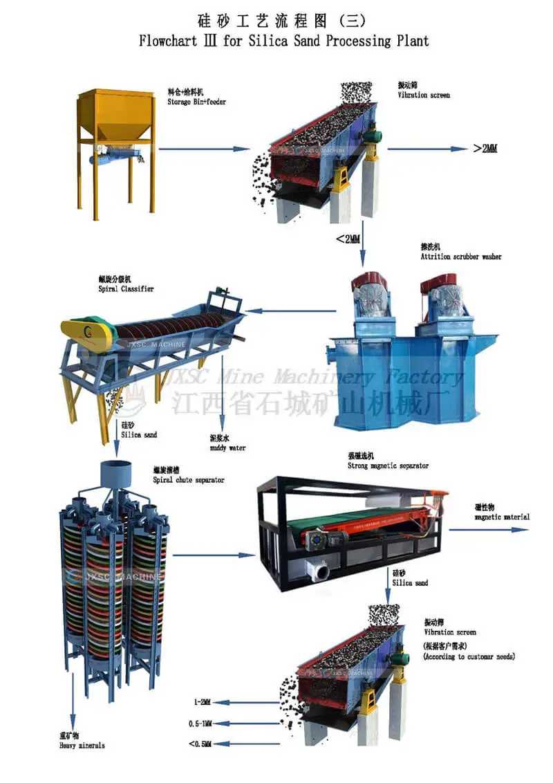 Silica sand washing plant includes Jaw crushers, wet rod mill, hydraulic classifier, desliming machine, magnetic separator, spiral separator, silica sand concentrate dewatering screen, tailings dewatering.