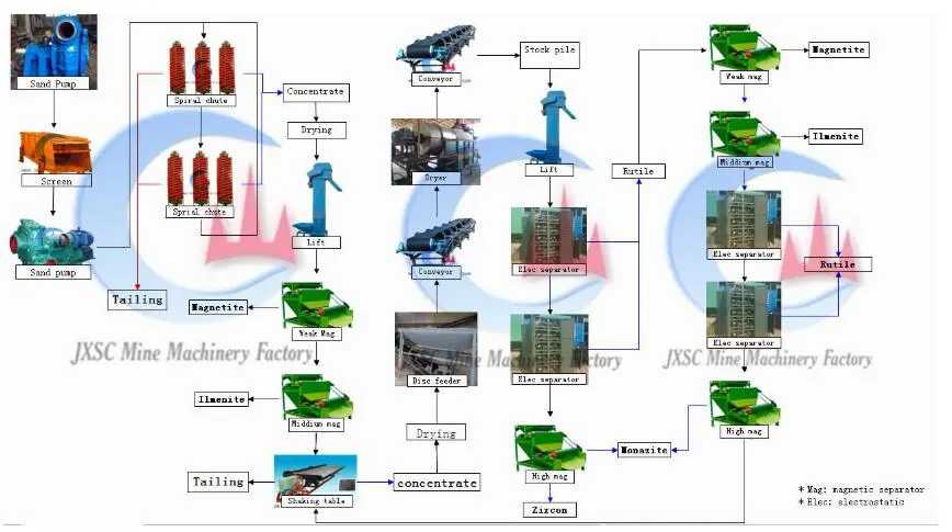 The aim is to recover magnetite, ilmenite, rutile and monazite which are associated with zircon. Magnetite can be recovered by weak magnetic separation, ilmenite and garnet can be recovered by strong magnetic separation, and monazite, rutile and zircon can be separated by high voltage electrostatic separator.
